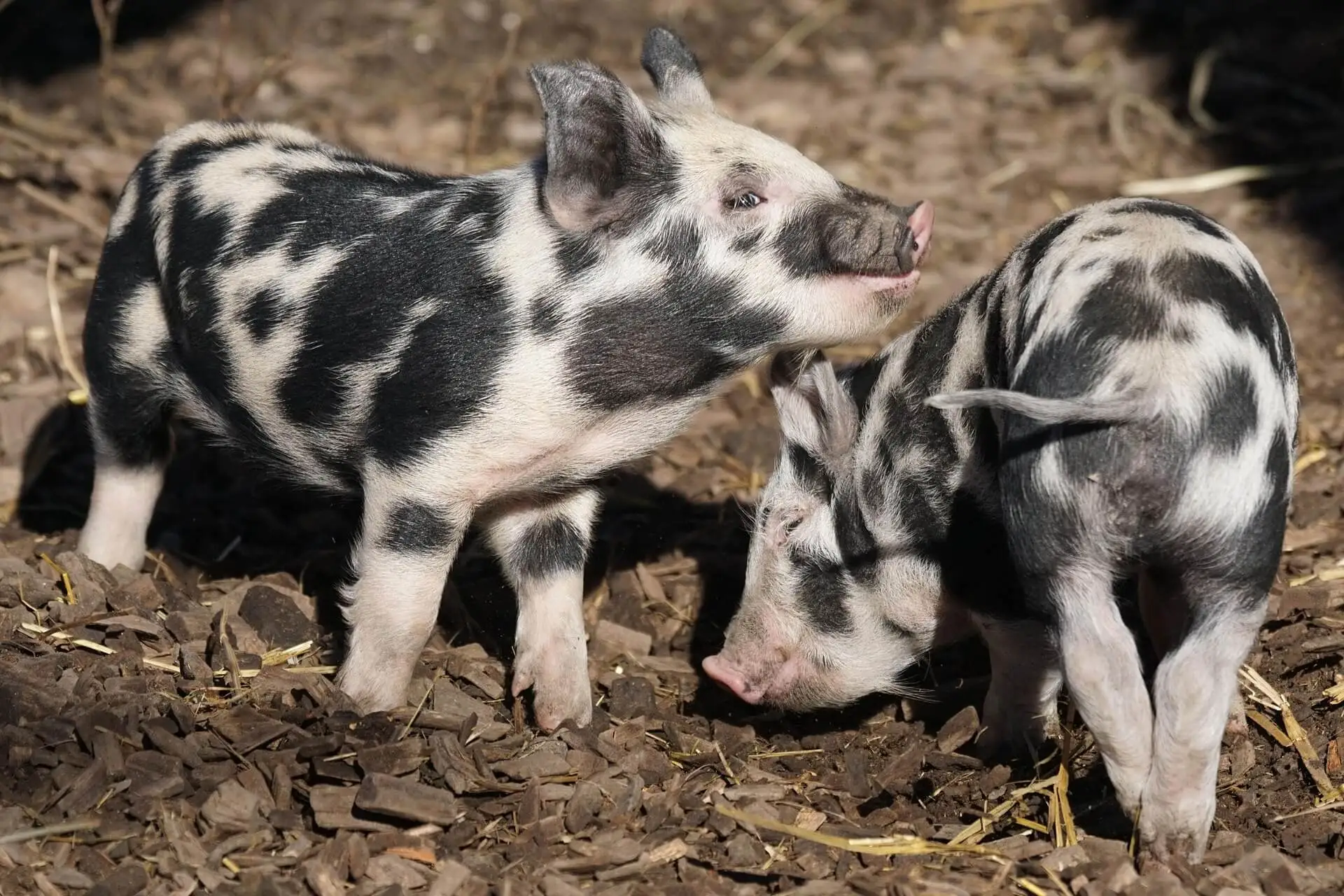 Die Beine sind kurz und stark, der Schwanz schwach geringelt. Farbvarianten sind weiß bis grau mit schwarzen Flecken.